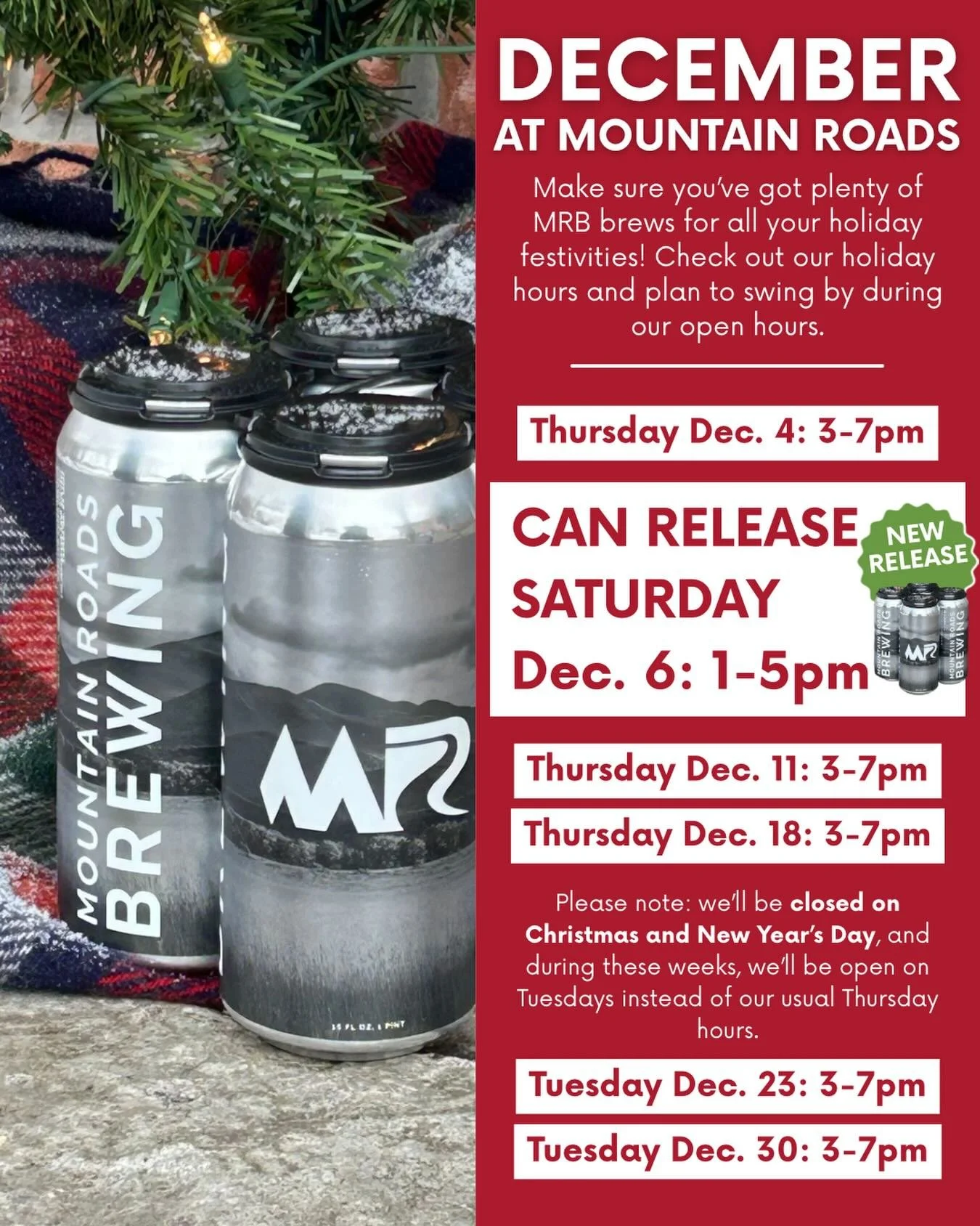 Make sure you’ve got plenty of MRB brews for all your holiday festivities! Check out our holiday hours below and plan to swing by during our open hours.